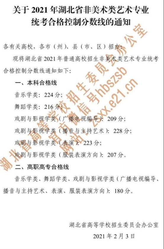 2021年湖北省非美术类艺术专业统考合格控制分数线的通知